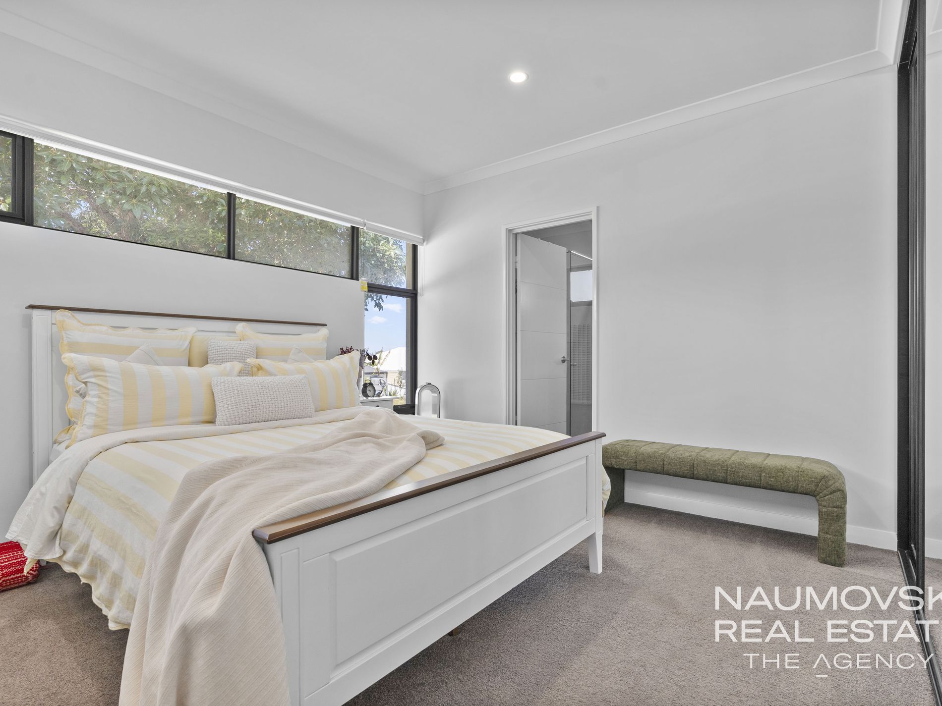 Featuring three spacious bedrooms and two modern bathrooms. The ensuite bathroom showcases beautiful wood look cabinets, stone benchtops, and his and her dwsigner sinks, offering a personal sanctuary to unwind after a long day. High ceilings throughout the home enhance the feeling of space and luxury.