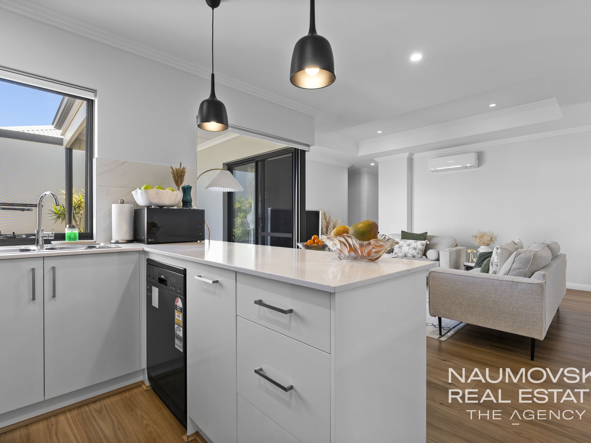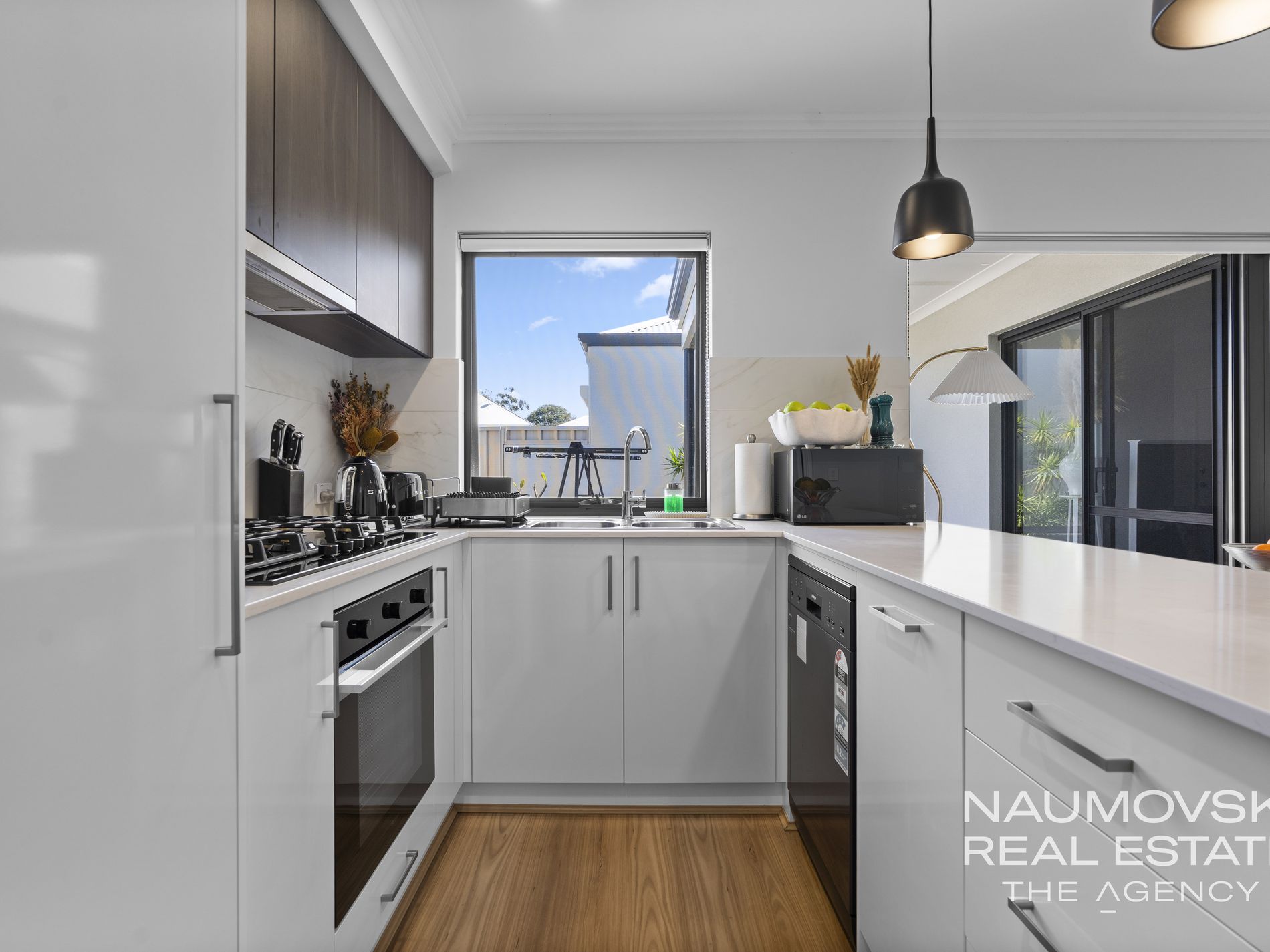 The kitchen is truly a chef's dream, complete with stone benchtops, stainless steel appliances, and beautiful gloss white and stylish wood look cupboards. The ample bench space overlooks the living, dining, and outdoor entertaining areas, making it a perfect space for the avid entertainer or for a busy parent looking after the kids.