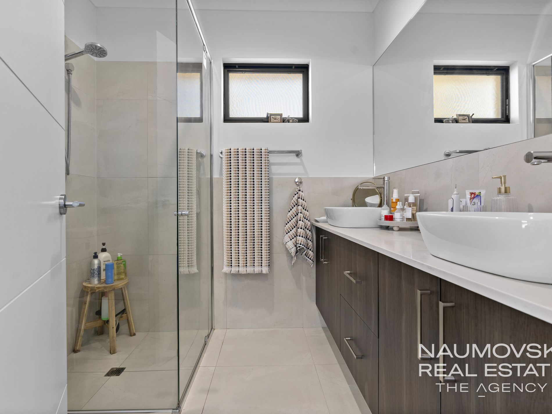 Modern and stylish bathrooms with stone benchtops and his and her sinks.