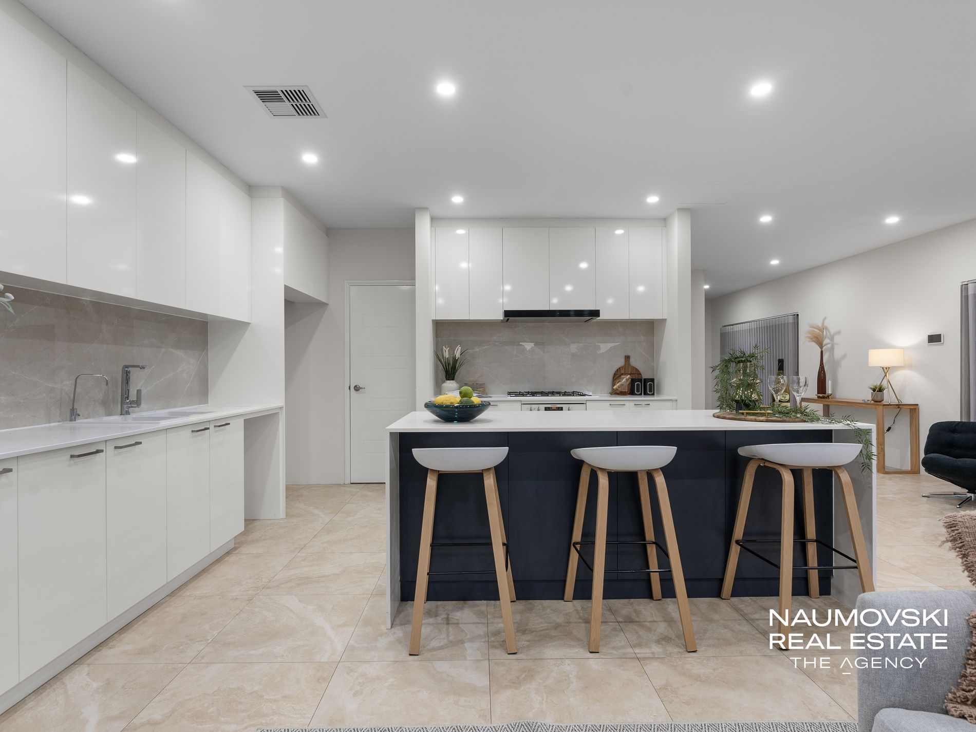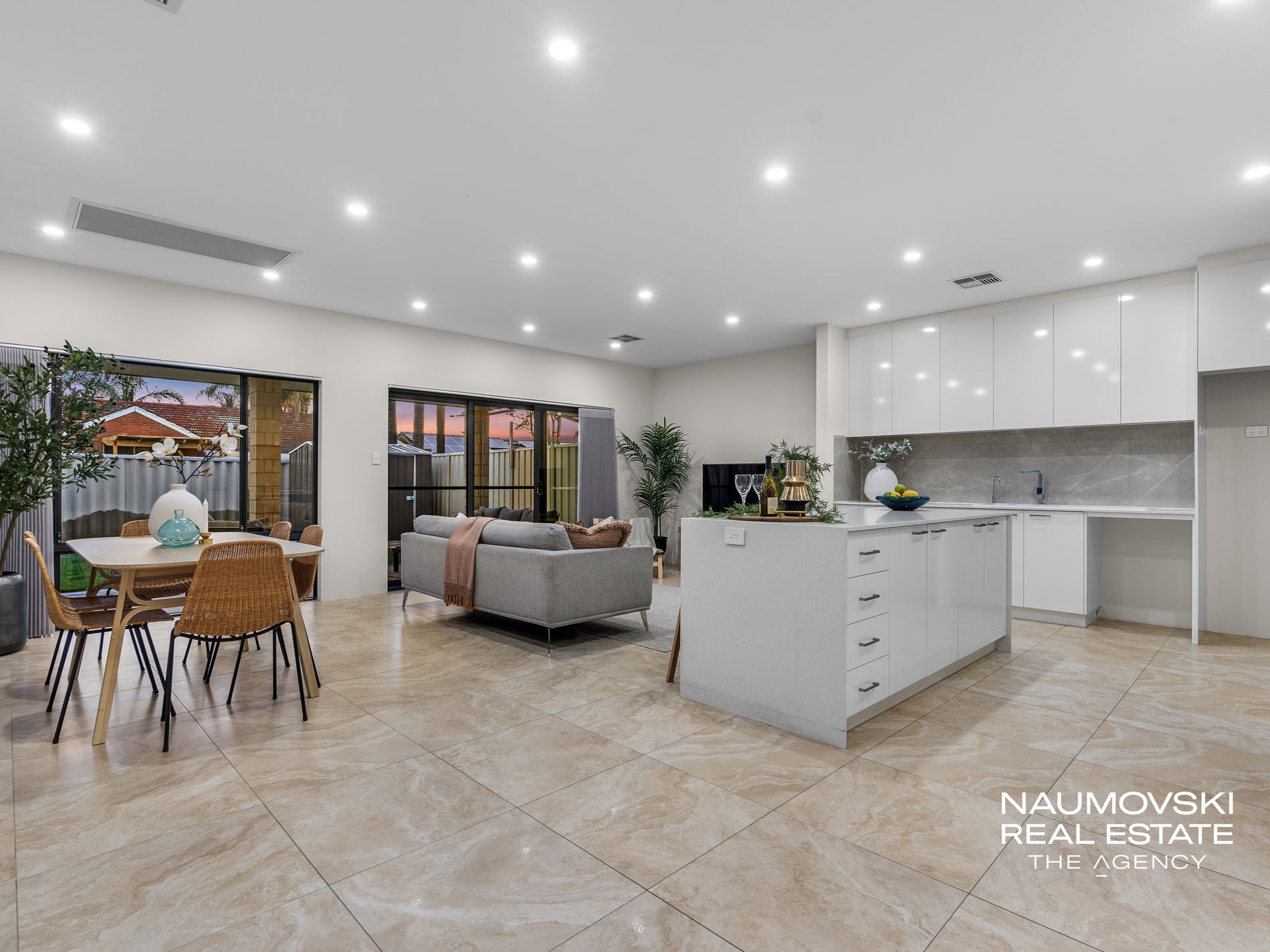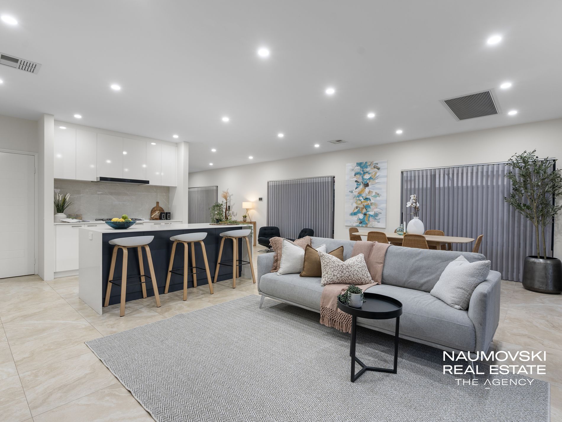 Step into a modern masterpiece at 12B Marda Way, Nollamara, where style, comfort, and convenience come together in perfect harmony. This immaculate five bedroom (or 4 bed + theatre), two bathroom home, built in 2020, looks as fresh as the day it was completed. From the moment you enter, you'll be captivated by the beautiful open plan living area, where natural light pours in through expansive windows, creating a bright and welcoming atmosphere. The heart of the home is the stunning kitchen, boasting waterfall stone benchtops, stainless steel appliances, and an abundance of storage, perfect for entertaining friends or preparing family feasts while keeping an eye on the kids.