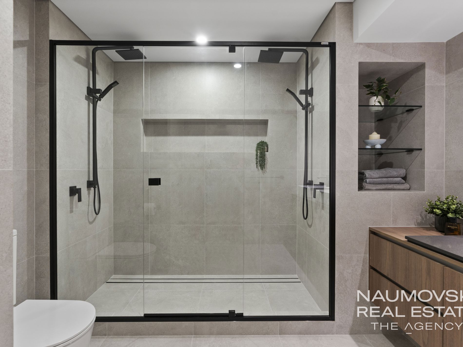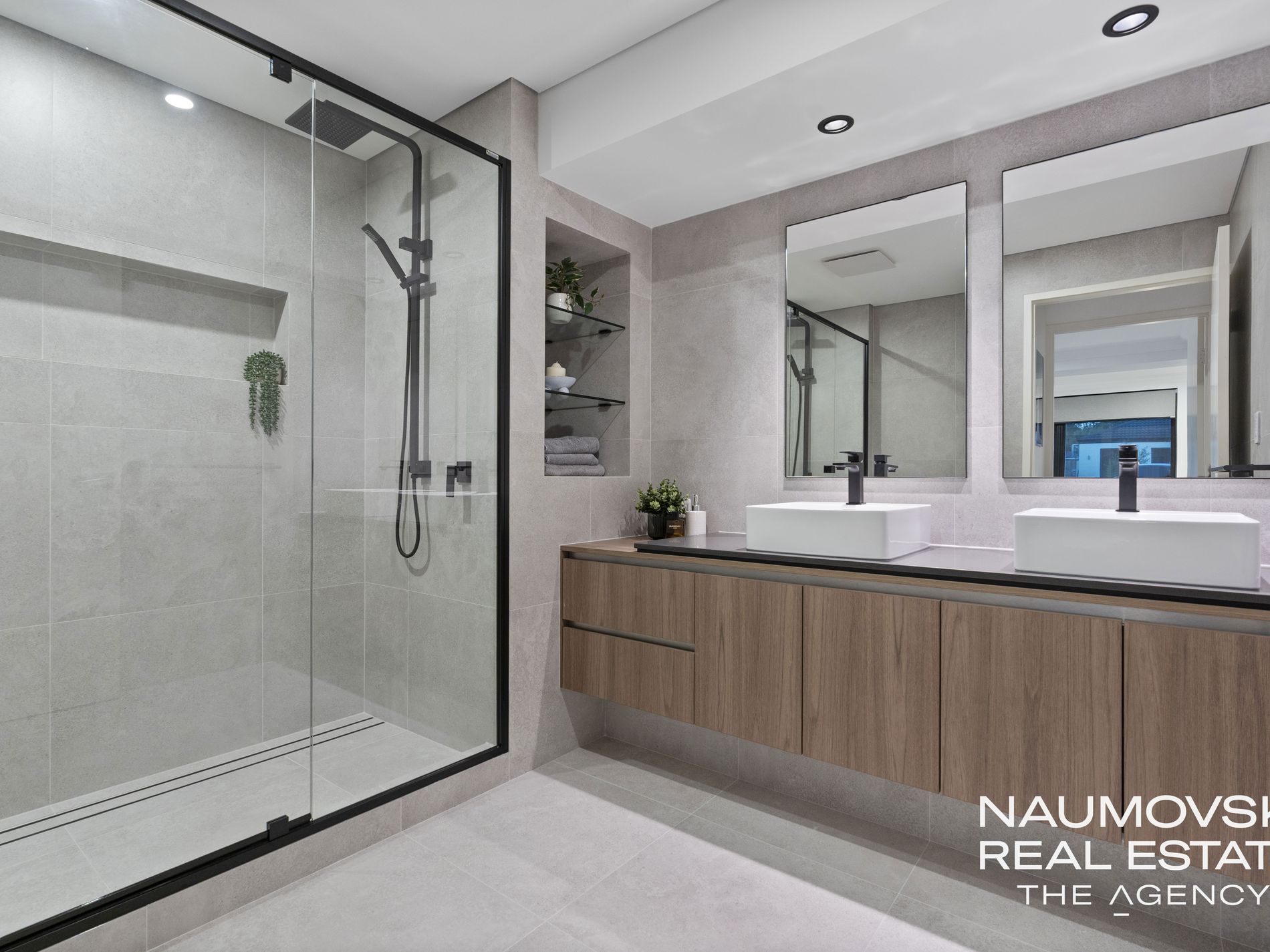 Four generously sized bedrooms, including two luxurious master suites at opposite ends of the home, offer outstanding versatility for guests, a home office, or multi-generational living. Both bathrooms exude modern sophistication, featuring floor-to-ceiling tiles, floating vanities, and the ensuite's double shower with dual rainwater heads and his-and-hers sinks, a true retreat after a long day.