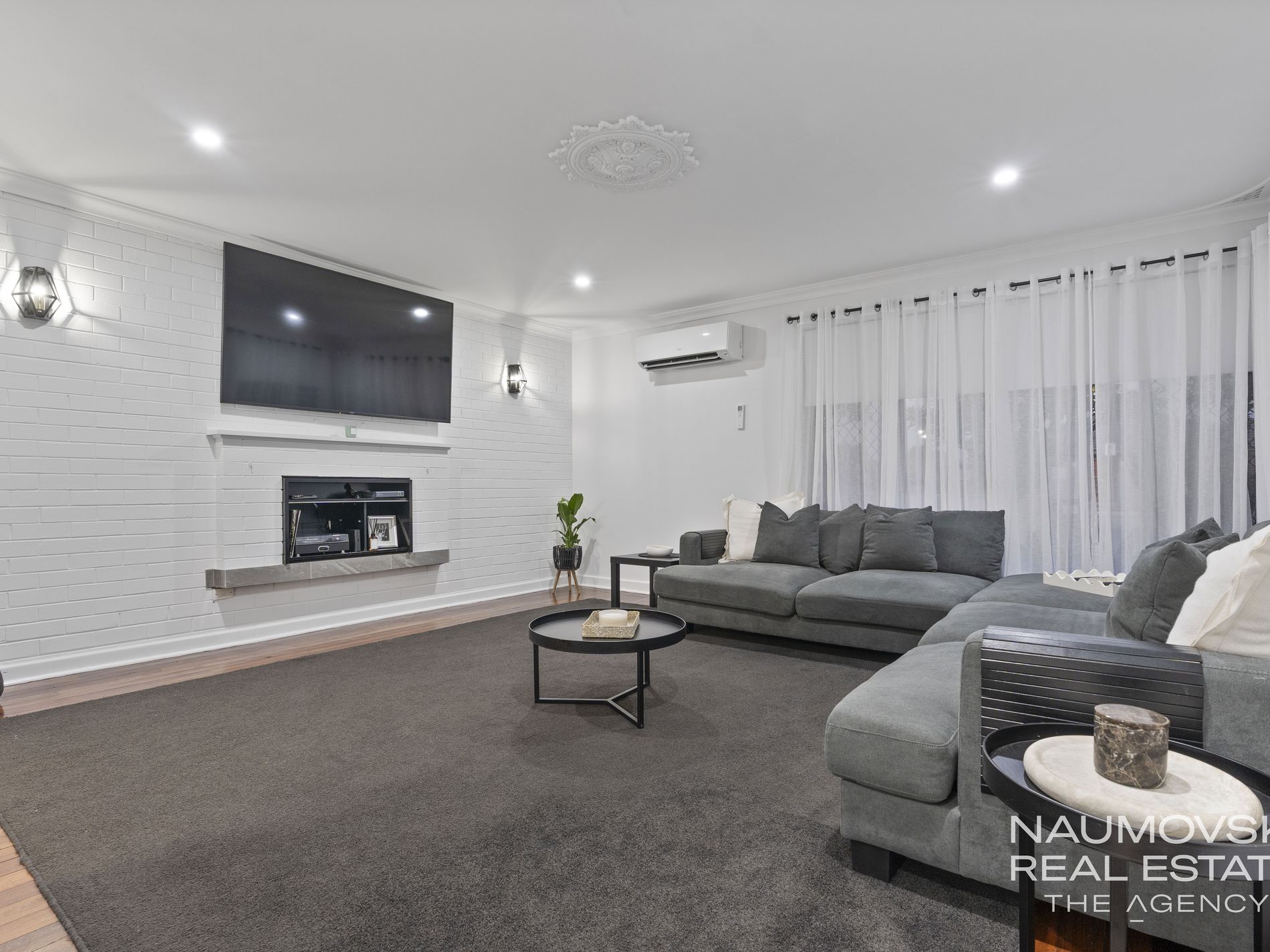 Striking living room with brick feature wall, fireplace entertainment unit, ceiling rose, and polished Jarrah floorboards