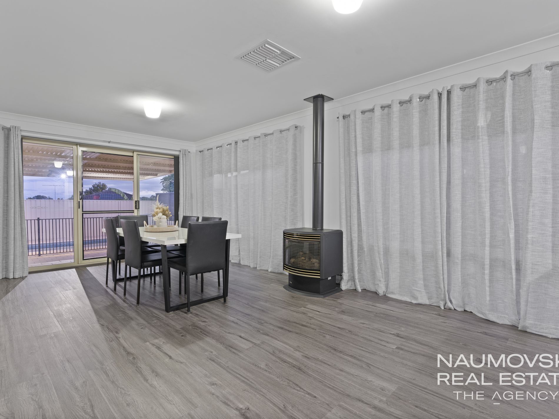 Chic timber loom floors adorn the modern open plan living and dining area.